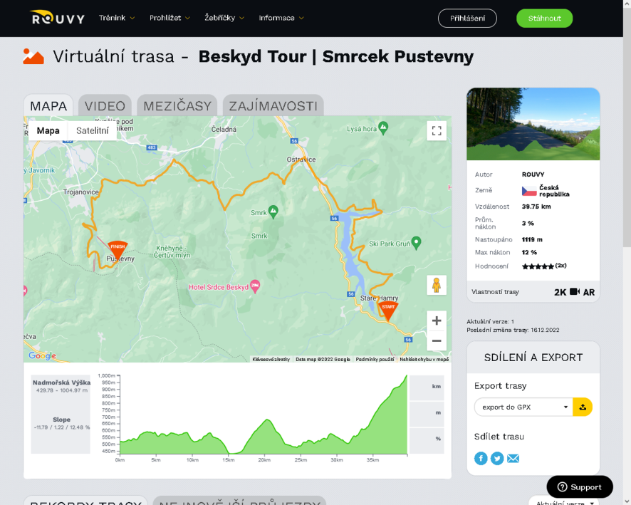 virtuálního závodu na prvním z pěti segmentů trasy Beskydu na ROUVY